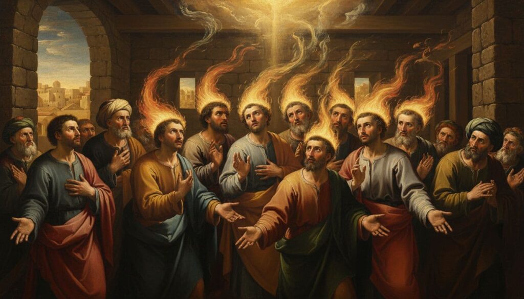 The apostles receive the Holy Spirit at Pentecost in Jerusalem.